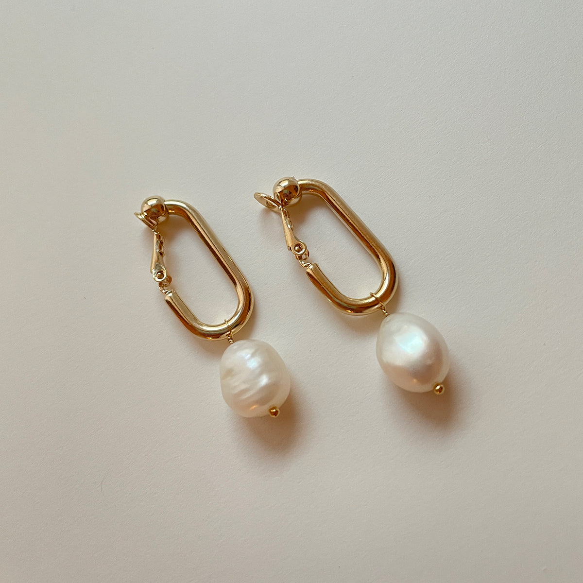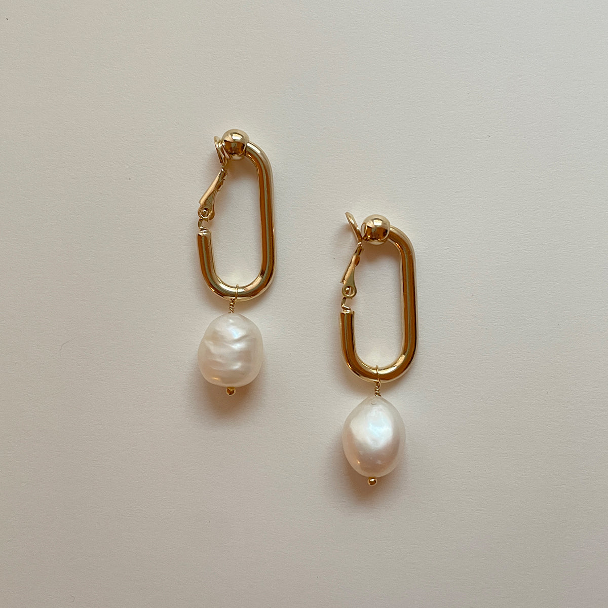大粒の淡水バロックパール をあしらったチャンキースクエアフープのイヤリングです。