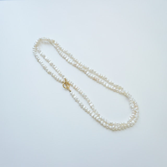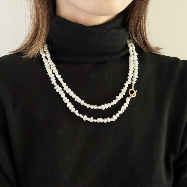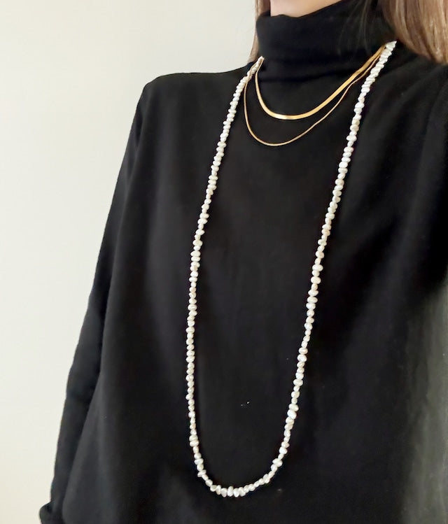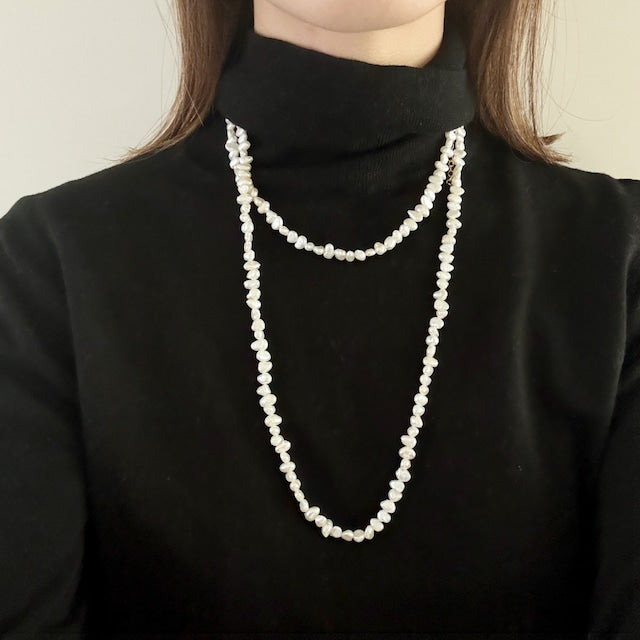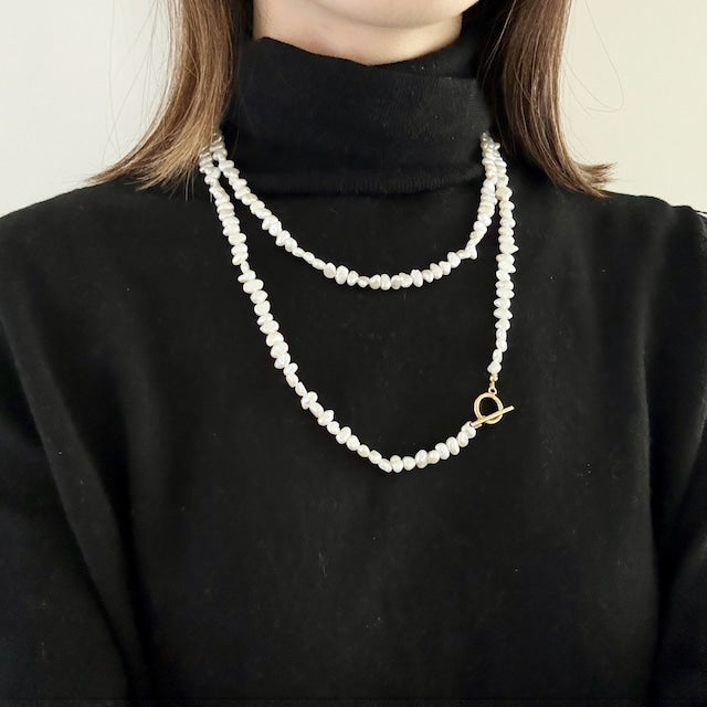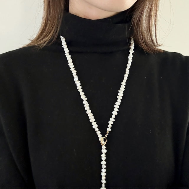 輝きと優雅さを纏う、淡水バロックパールのロングネックレス。 バロックパールは天然のパールなので、一粒一粒の個性が異なります。 そのため、完全に同じものは存在せず、オンリーワンのアクセサリーとなります。 どんなスタイルにも馴染む上品な存在感があり、女性の魅力を引き出します。