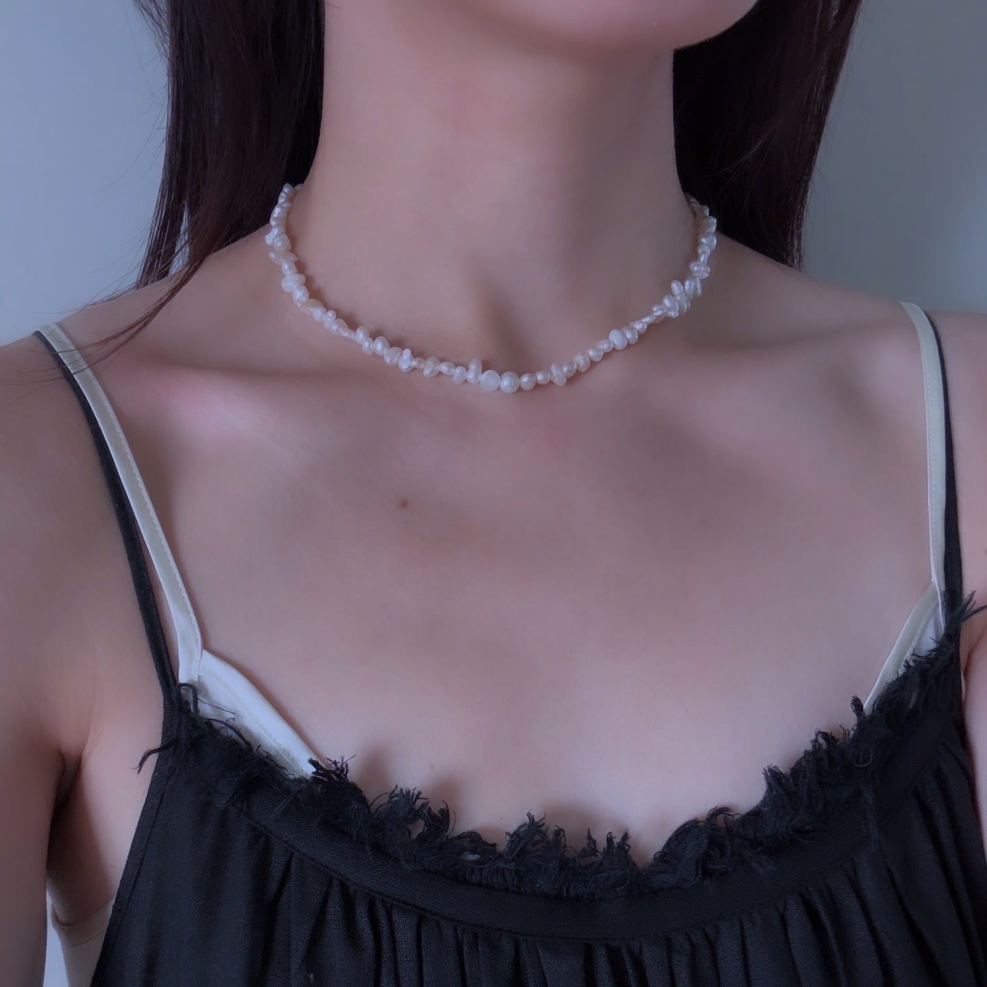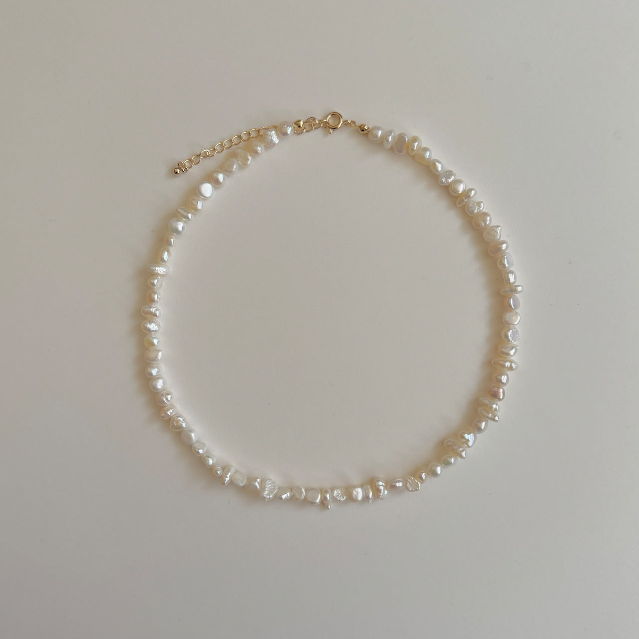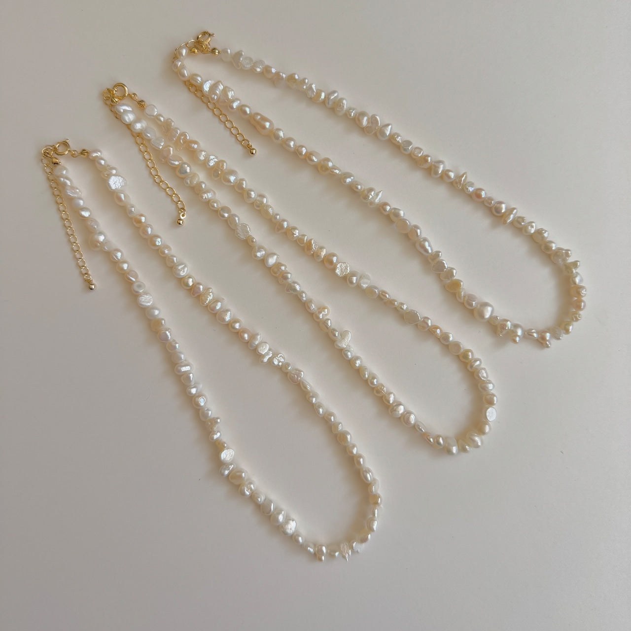 ステイシーで1番人気の高いネックレスの長さやデザインのベースはそのままに、いびつな形のパールを集めて組み合わせたネックレスです。製造の過程でカタチが規定と異なるために省かれてしまったパールを使用し、アウトレット品として販売しております。